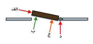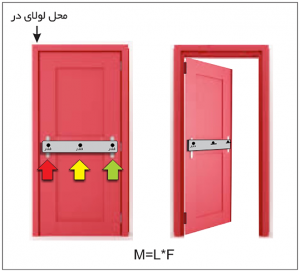 در تصویر بالا، اعمال نیرو در جهات مشخصشده و بر نقاط “الف” و “د”، که هیچ فاصلهای با مرکز گشتاور ندارند، در را به حرکت در نمیآورد، اما این اعمال نیرو در نقطه “ب”، در را به آسانی جابجا میکند، در حالیکه در نقطه “ج” به جهت فاصله کم تا لولای در یا مرکز گشاور، باید انرژی بیشتری برای جابجایی در صرف نمود.