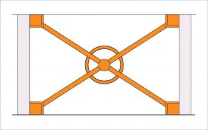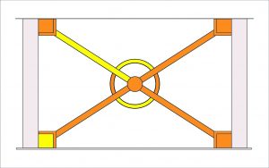 این معلم خلاق ریاضیات و هندسه به کمک دانشآموزان مدرسه، با برش تختههای چوبی و نصب آنها روی این بادبند، سطح فلزی نازیبای آن را میپوشاند. پس از آن، قطعات مختلف اصلی در اجزاء این بادبند را نامگذاری میکند. محل تلاقی دو تیر مورب که به مانند قطرهای یک مستطیل هستند را O مینامد و چهار رأس این مستطیل را با حروف A، B، C و D مشخص میکند. زاویههای 1O تا 4O را هم به کمانهایی از جنس چوب و یا پلکسی، مشخص میکند. در این مرحله، هر کدام از طولهای اضلاع این مستطیل و کمانهای زوایههای مختلف آن و همچنین هر قطعه از قطرهای آن را با یک چراغ نوار اسامدی مات که خیرگی بالایی نداشتهباشد مجهز میکنند. در این وضعیت، هر کدام از این زوایا و پارهخطها، این قابلیت را پیدا میکنند تا با یک کلید مخصوص روشن یا خاموش شوند.
